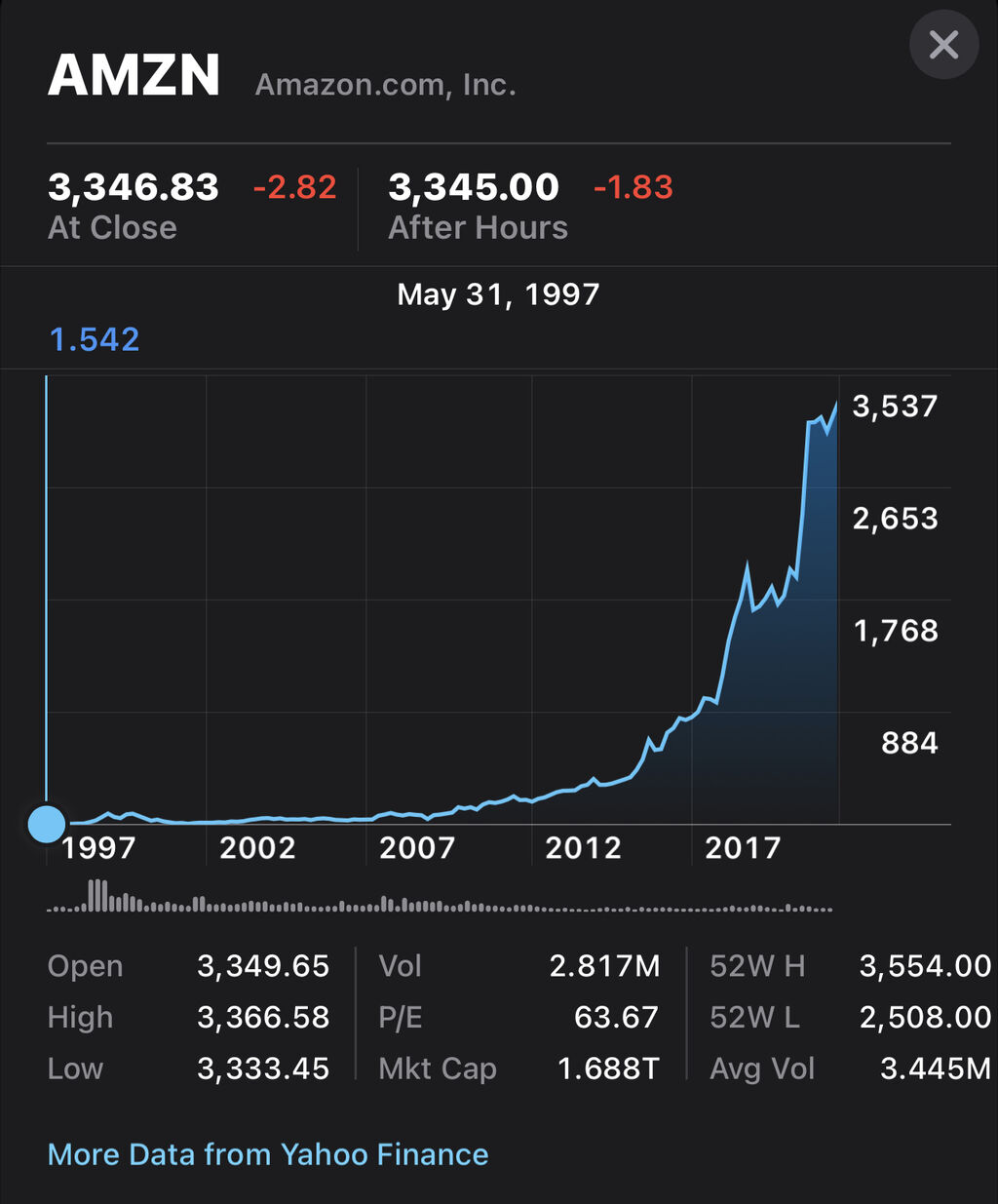 1997年5月15日、Amazon.comはNASDAQに上場(ティッカーシンボルはAMZN)し、1株あたりの価格18.00米ドルで新規株式公開した(1990年代末に行われた3回の株式分割の結果、1株1.50米ドルとなった)