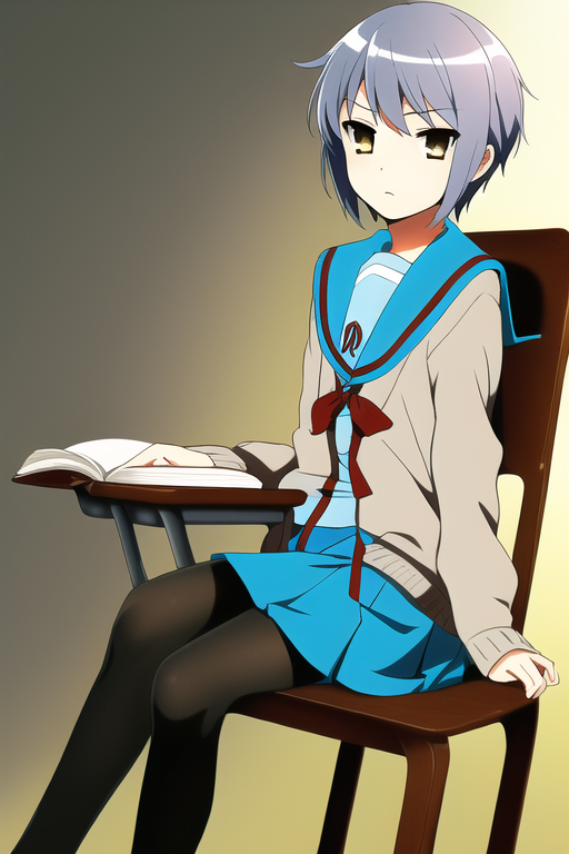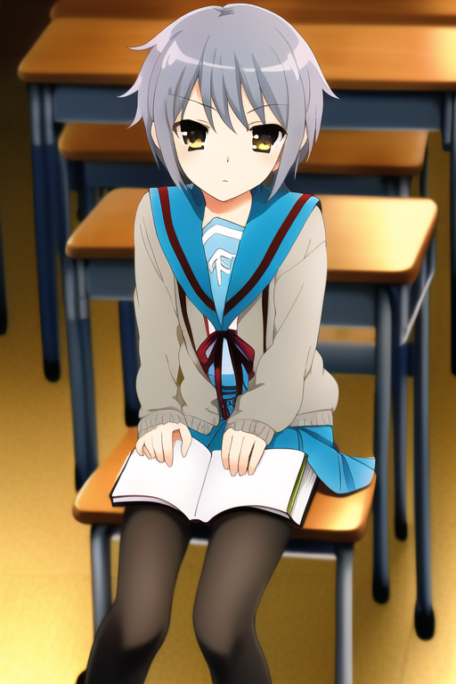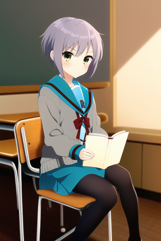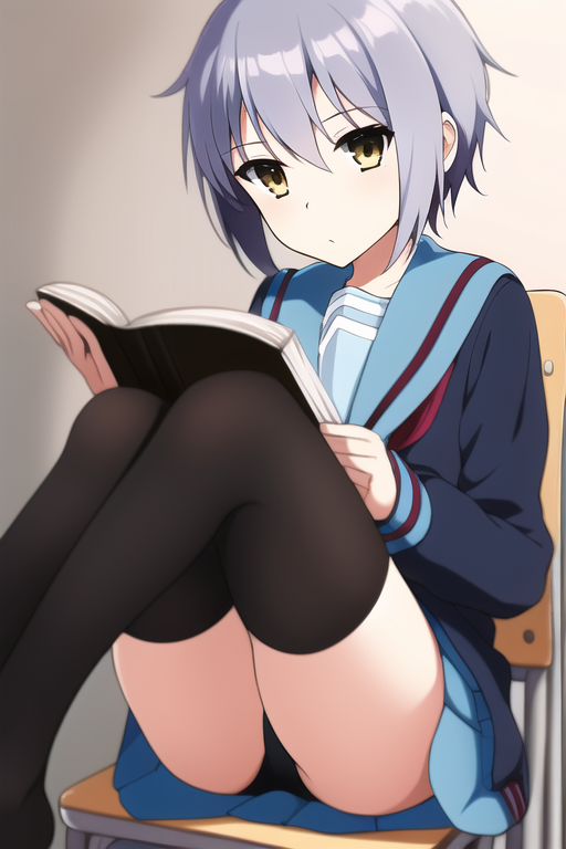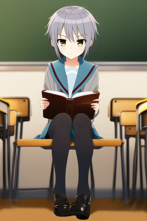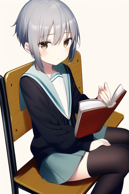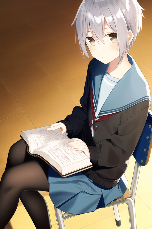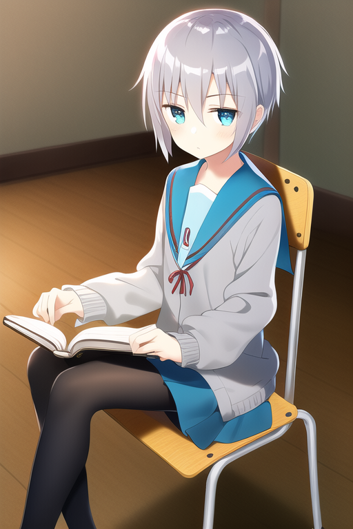 solo, 1girl, masterpiece, beautiful detailed,{{{flat cheast}}}, {nagato_yuki} ,(expressionless:4),[jitome],[blank_stare],closed mouth,short cut ,blue gray hair, serafuku, {suzumiya haruhi no shoushitsu}, cardigan, sitting, school chair, reading book, black tights,look at away