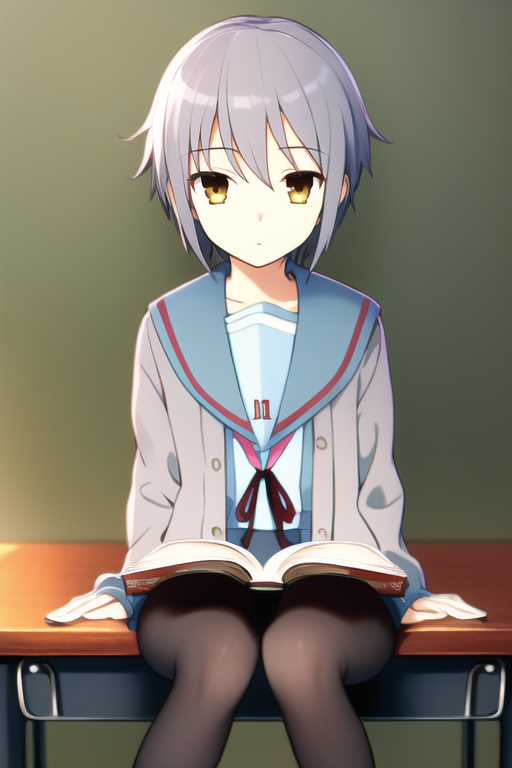 solo, 1girl, masterpiece, beautiful detailed,{{{flat cheast}}}, nagato_yuki , short cut ,blue gray hair, serafuku, suzumiya haruhi no shoushitsu, cardigan, sitting, school chair, reading book, black tights,