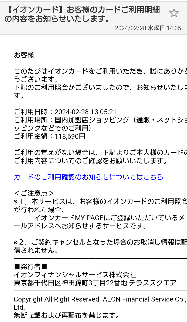 もしイオンカード持ってたら騙されそうだけど、リンク踏まずにまずはこっちからカード会社に確認だな