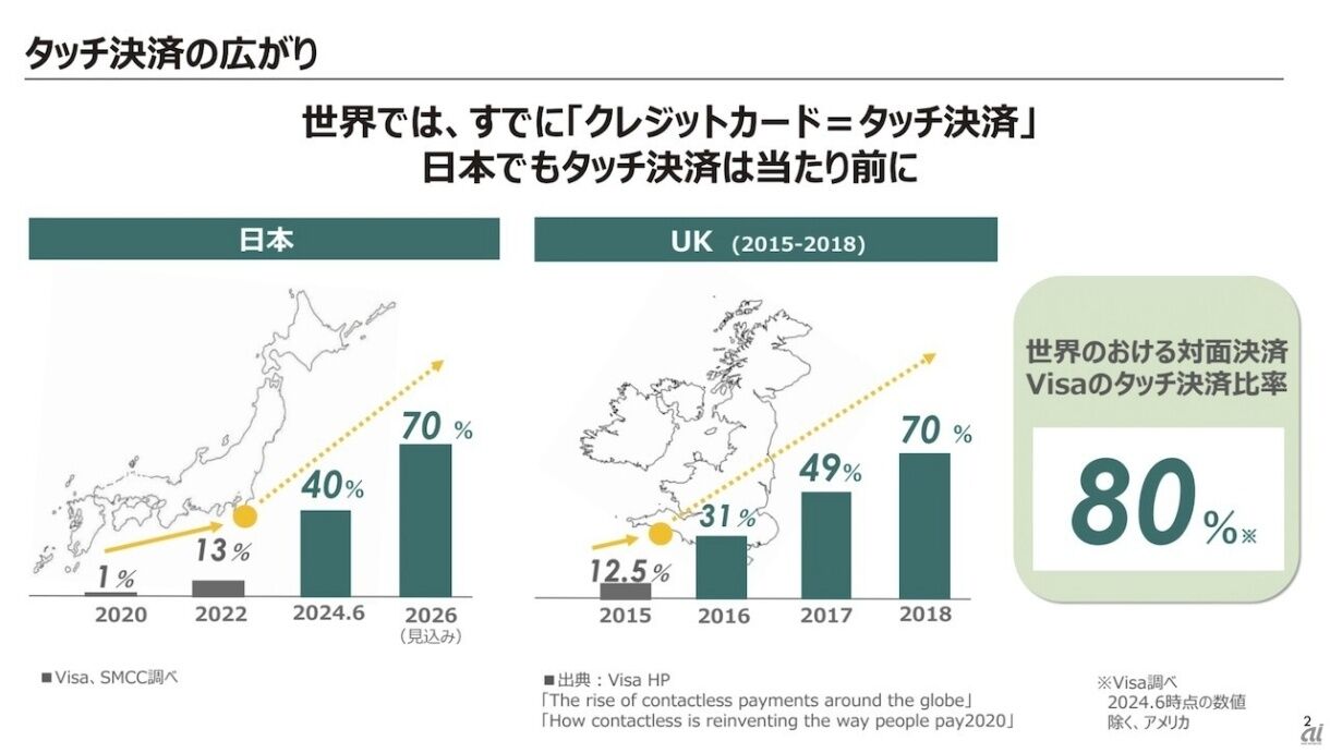 なお、米国を除く世界全体におけるタッチ決済の比率は2024年6月時点で80%だという。2010年代半ばからタッチ決済が普及していた英国の例では、比率が20%を超えた段階から利用が急拡大したといい、日本でも2026年にはタッチ決済の比率は70%に達する見通しだという。