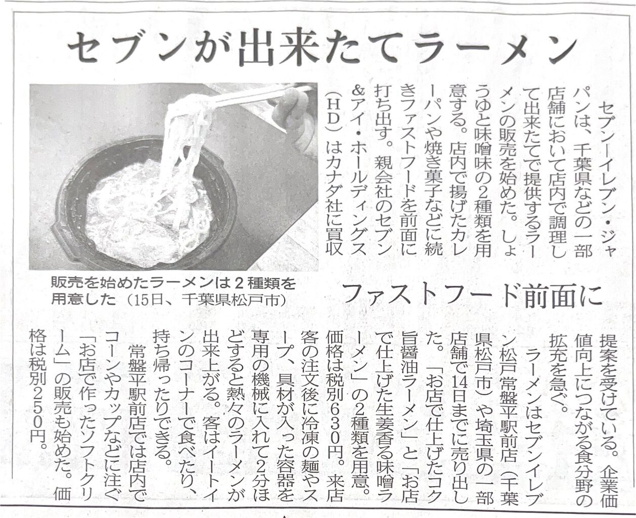 セブン―イレブン・ジャパンは、千葉県などの一部店舗において店内で調理して出来たてで提供するラーメンの販売を始めた。