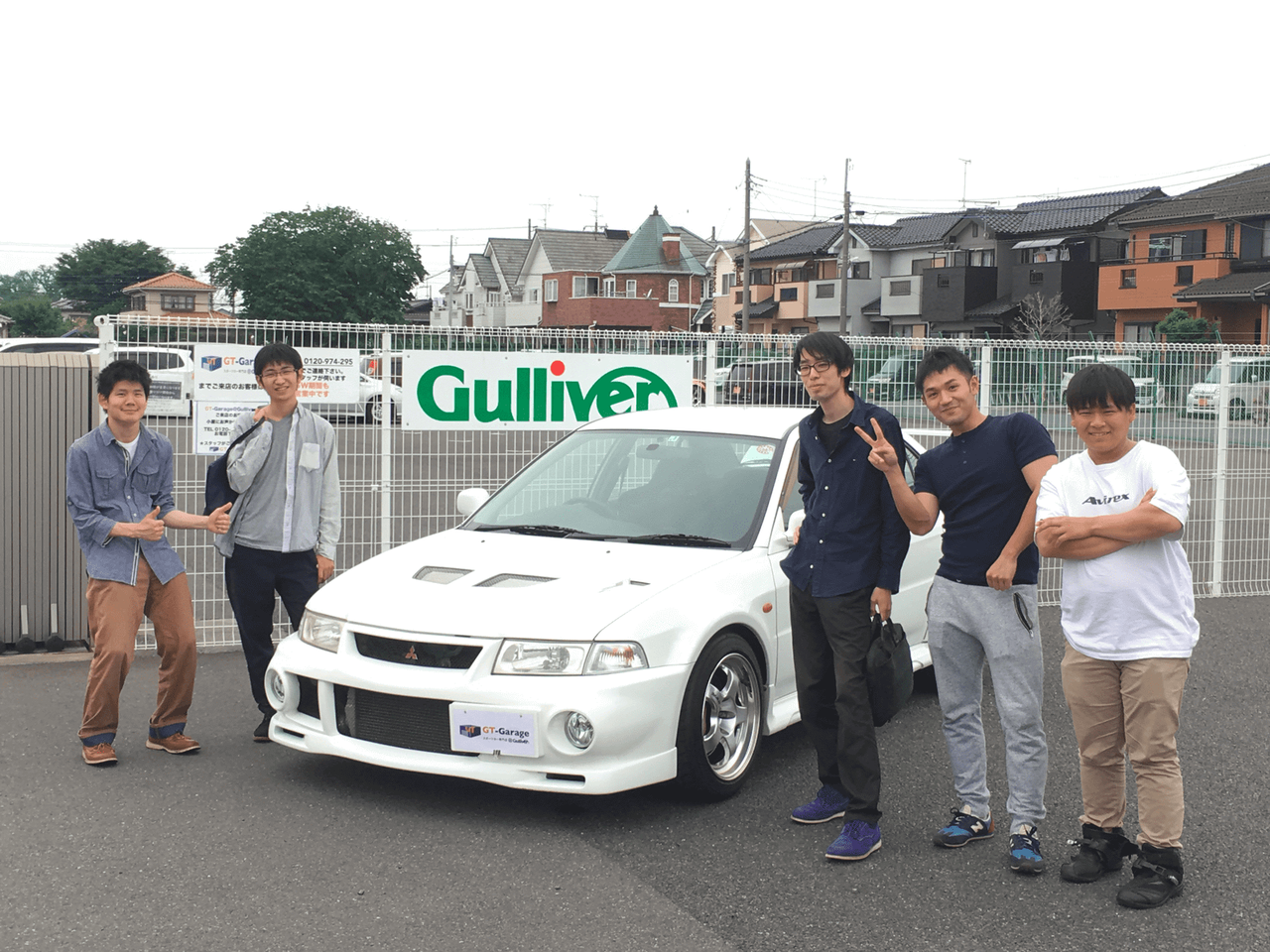 数名の営業とメカニックが並んでおめでとうございますって言葉と観葉植物をくれたわ
