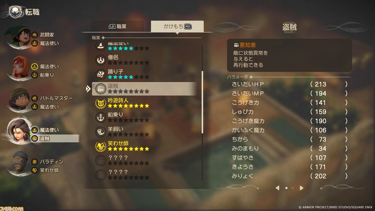 ふたつの職業をかけもちすることも可能に。職業ごとに習得する呪文や特技、パラメータが違うので、組み合わせ次第で戦術は広がっていく。