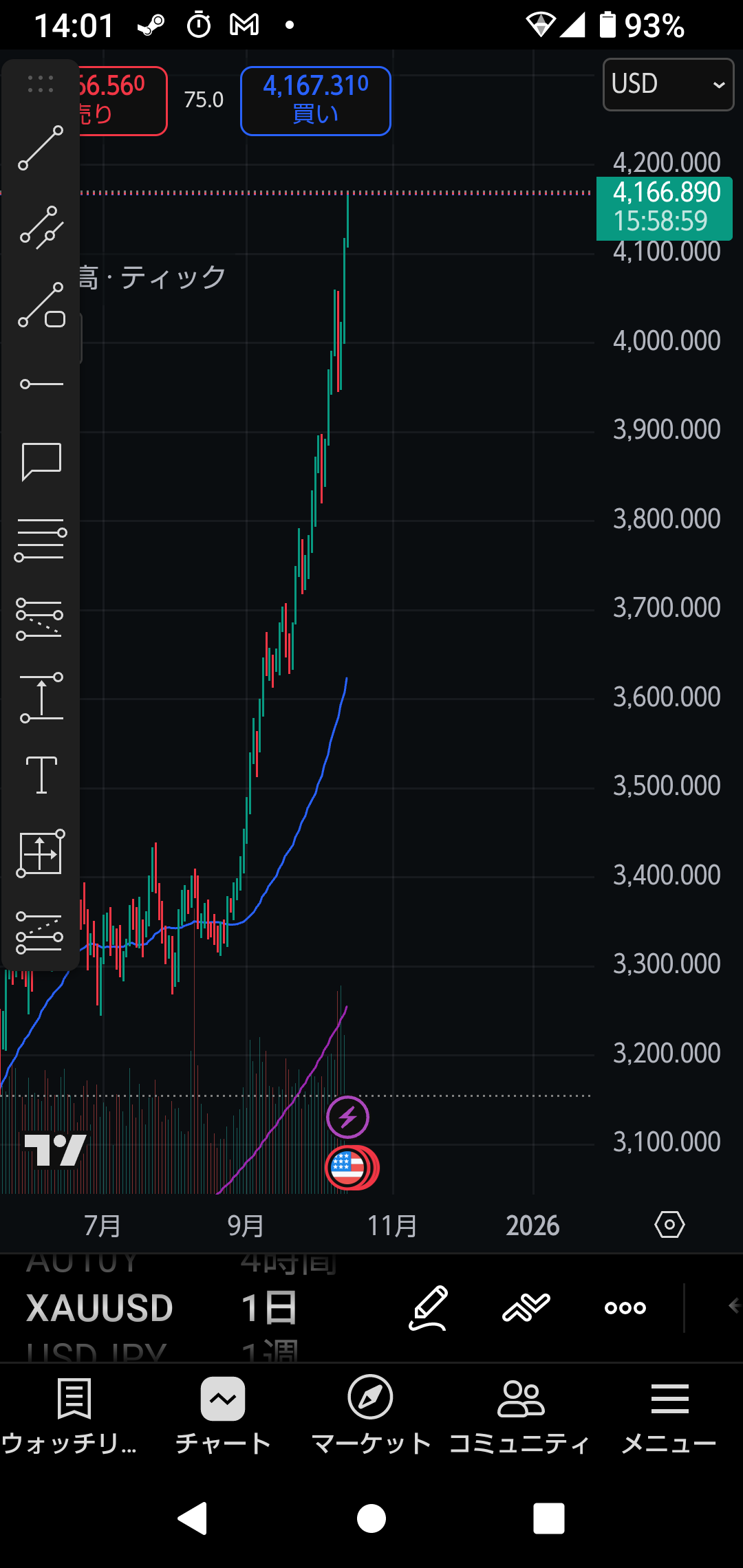 基本的にはドルが買われるとゴールドは下がるんだけど最近は全然連動してないね