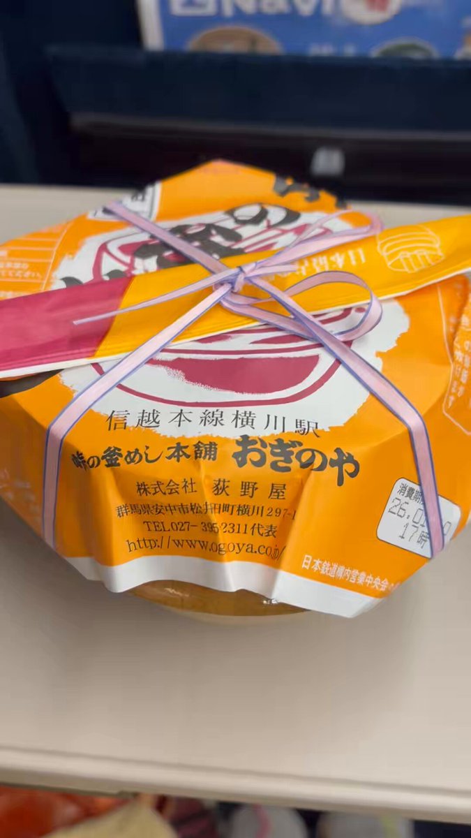昨日のライブ帰りの新幹線にて。スタッフさんが用意してくださった、株式会社荻野屋さんの釜飯を頂く荻野目。