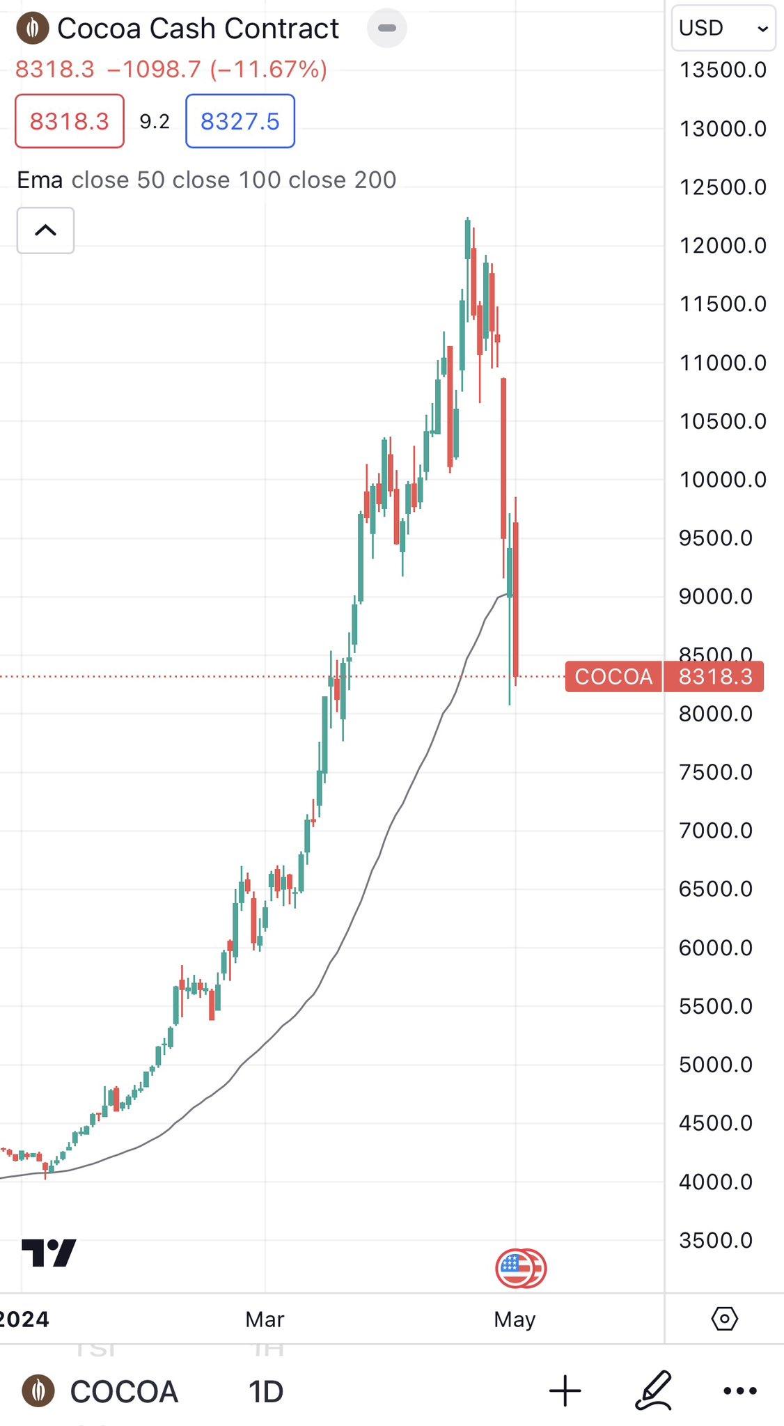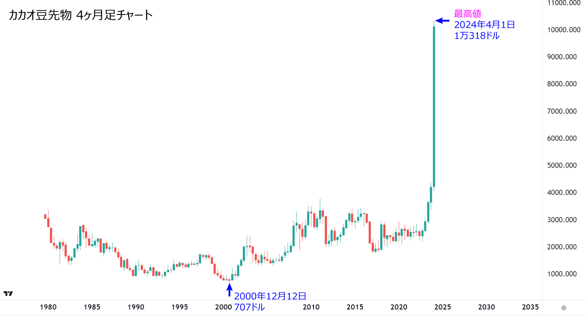 カカオ豆の先物価格は昨年末に同約4200ドルで推移していたが、今年に入って2倍超に上昇した。主要金属の銅の先物価格(1トンあたり約9000ドル)を上回る水準となっている。